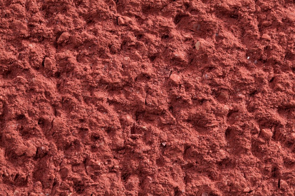 Roter Ayersrock Lehmputz. Zusammengesetzt aus Sand, Ton und Stärke. Neben Ton und pflanzlicher Stärke sorgen feinste Marmorsande von besonderem Glanz für eine ebenso feine wie lebendige Struktur